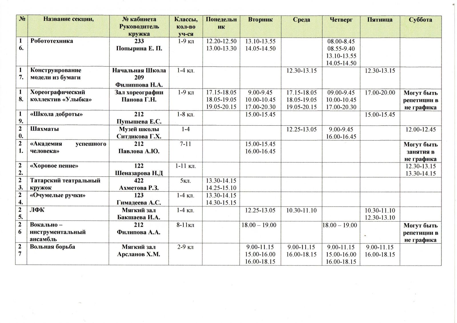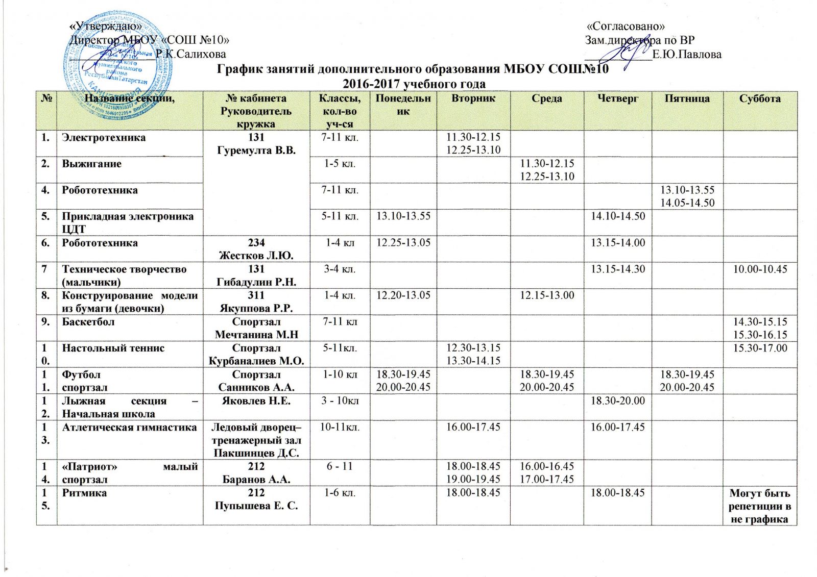 Расписание работы кружков и секций дополнительного образования на 2016-2017 учебный год 31.10.2016