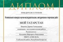 11 В сыйныф укучысы Иванова Даринаны «Минем Татарстан» фәнни-тикшеренү, методик һәм иҗади эшләр региональ конкурсында җиңү белән котлыйбыз, җитәкчесе Кузьмина Маргарита Николай кызы ,тарих һәм җәмгыять белеме укытучысы.