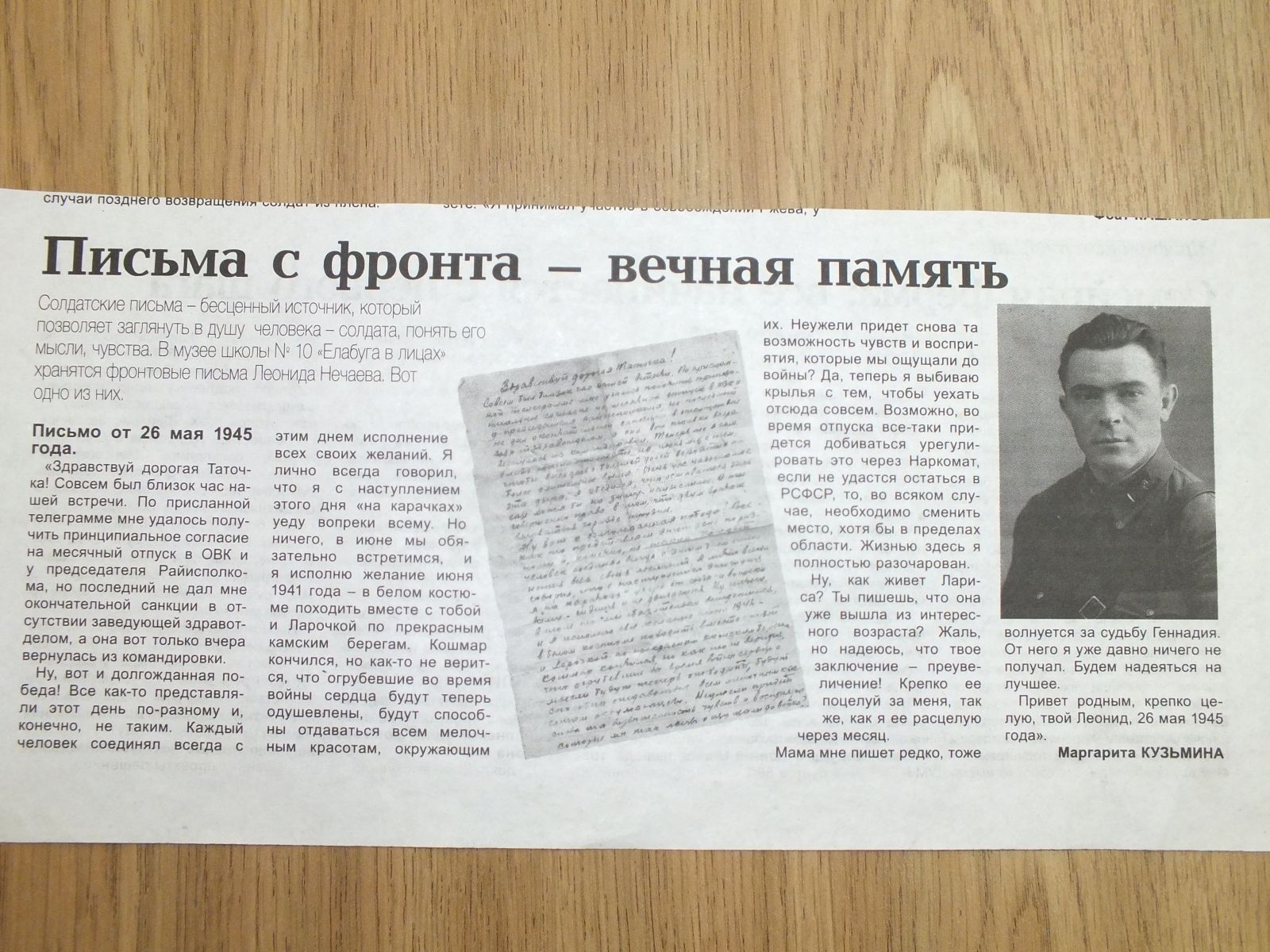 ►Кузьмина М. Письма с фронта - вечная память: Фронтовые письма, хранящиеся в фонде школьного музея "Елабуга в лицах"// Новая Кама. - 2015. - 15 апреля. - С. 3 - Посмотреть