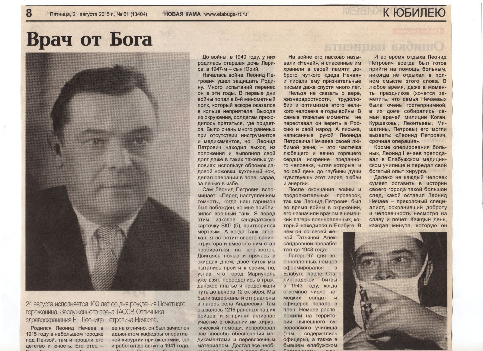 ►Кузьмина М. Врач от Бога: к 100-летию со дня рождения Почетного горожанина Л.Нечаева// Новая Кама. - 2015 . - 21 августа. - С.8 - Посмотреть, продолжение
