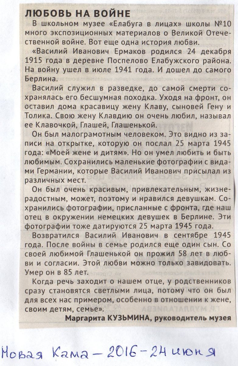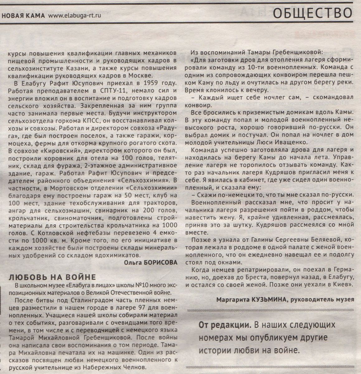 ►Кузьмина М. Любовь на войне// Новая Кама. - 2016. - 24 июня - По материалам школьного музея "Елабуга в лицах" - Посмотреть