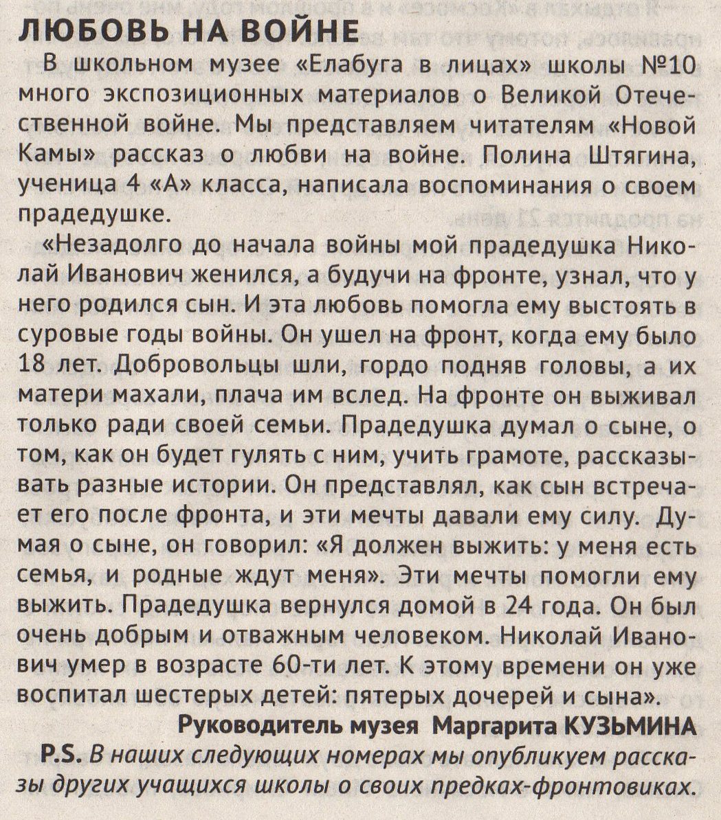 ►Кузьмина М. Любовь на войне// Новая Кама. - 2016. - август - По материалам школьного музея "Елабуга в лицах" - Посмотреть