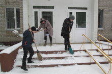 Учащиеся среднего звена очистили всю территорию школы от мусора. А ребята начальных классов подметали асфальтированную дорожку засыпанную свежим снегом.