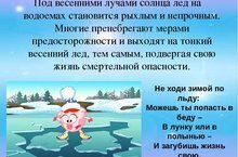 С наступлением февральской оттепели ситуация на водных объектах находится на особом контроле. Днём температура воздуха нередко достигает плюсовых значений, и лёд начинает постепенно «худеть». Уважаемые родители! Уделите внимание своим детям, расскажите об опасности выхода на непрочный лед. Интересуйтесь, где ваш ребенок проводит свободное время. Не допускайте переход и нахождение детей на водоемах в зимне-весенний период. Особенно недопустимы игры на льду! Легкомысленное поведение детей, незнание и пренебрежение элементарными правилами безопасного поведения - первопричина грустных и трагических последствий.