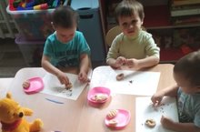 Дошкольники младшей группы занимаются лепкой из соленого теста. Учёными доказано, что развитие логического мышления, связной речи, памяти и внимания тесно связано с развитием мелкой моторики и координации движений пальцев рук.