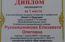 1 место Рукавишниковой Е.О. в муниципальном конкурсе сочинений о профессиях "Билет в будущее" среди 7-10 классов.7 - 8 сыйныф укучылары арасында үткән "Киләчәккә билет" дип аталган сочинениеләр бәйгесендә 1 нче урынны Рукавишникова Елизавета алды.