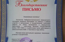 Организация помощи в поисковой работе по сбору материалов о медицинских работниках – участниках ВОВ и работников тыла, работавших в эвакогопитале 4089. 23 января в Тарловку приехала делегация из Набережночелнинского мед. колледжа для которой мы организовали встречу с ветераном ВОВ Шоркиной М.Д. и предоставили всю имеющуюся информацию по Эвакогоспиталю 4089.