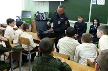 В преддверии празднования 100-летия уголовного розыска МВД России в гости к учащимся кадетских классов были приглашены сотрудники Елабужского отделения МВД Перед ребятами выступили : начальник отделения уголовного розыска майор полиции Валиуллин И.А., старший следователь следственного отдела майор юстиции Шабалина О.А., инспектор ПДН майор полиции Алабужева Э.В.. Самый живой интерес вызвало выступление старшего эксперта криминалистики майора полиции Иванова Э.Н, который пришел на встречу с загадочным чемоданом и наглядно показал ребятам, как работают криминалисты.