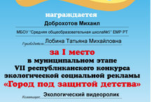 Доброхотовлар Михаил һәм Владиславны «Балачак саклый торган шәһәр " дигән VII Республика социаль һәм экологик реклама конкурсының муниципаль этабында җиңүләре белән котлыйбыз. Афәрин!!! Укытучылар Лобина Т. М. һәм Игнатьева Т. А.