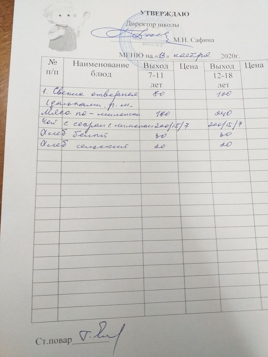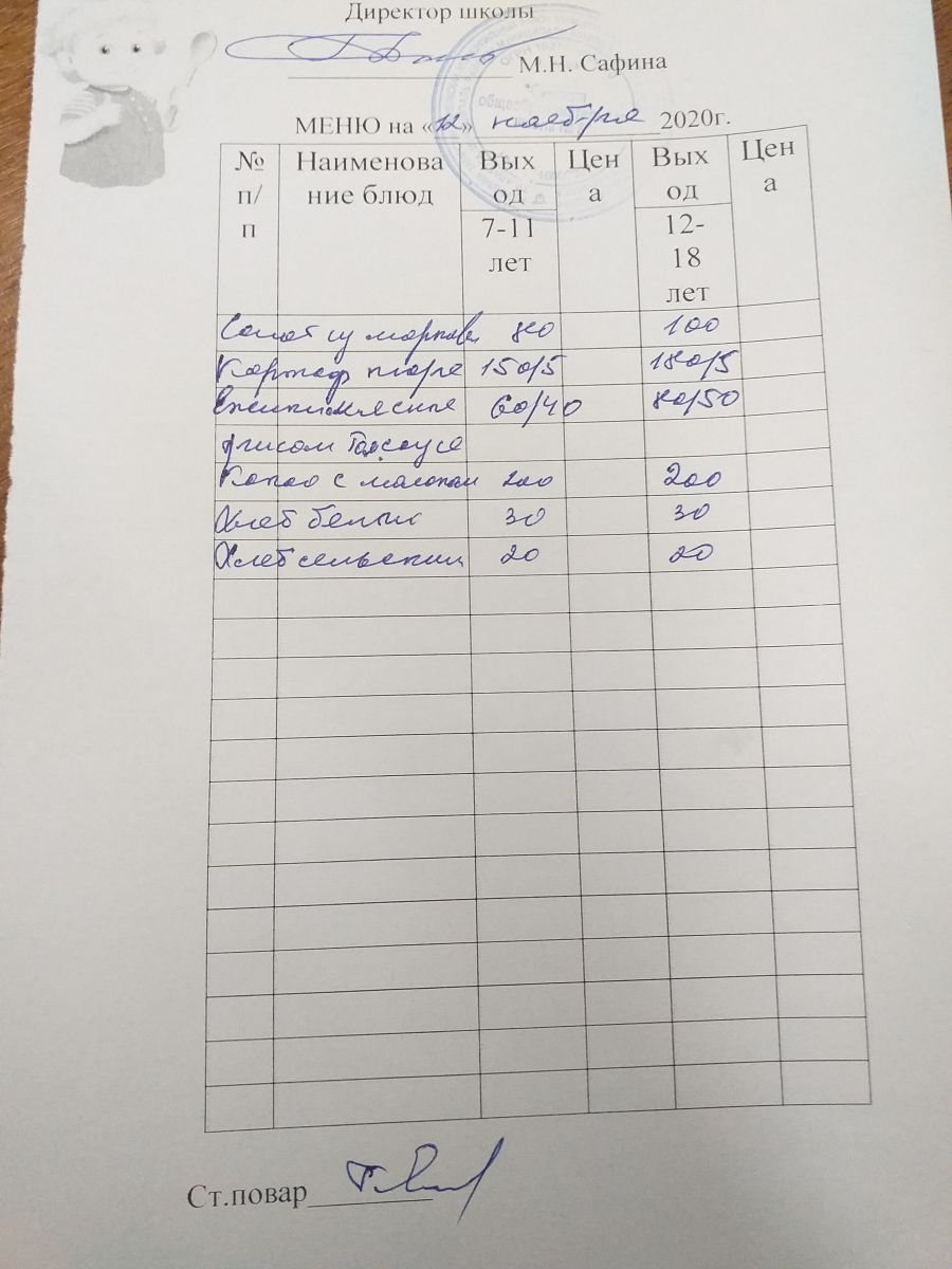 Меню пришкольного лагеря. Мәктәп яны лагере өчен меню 06.11.2020