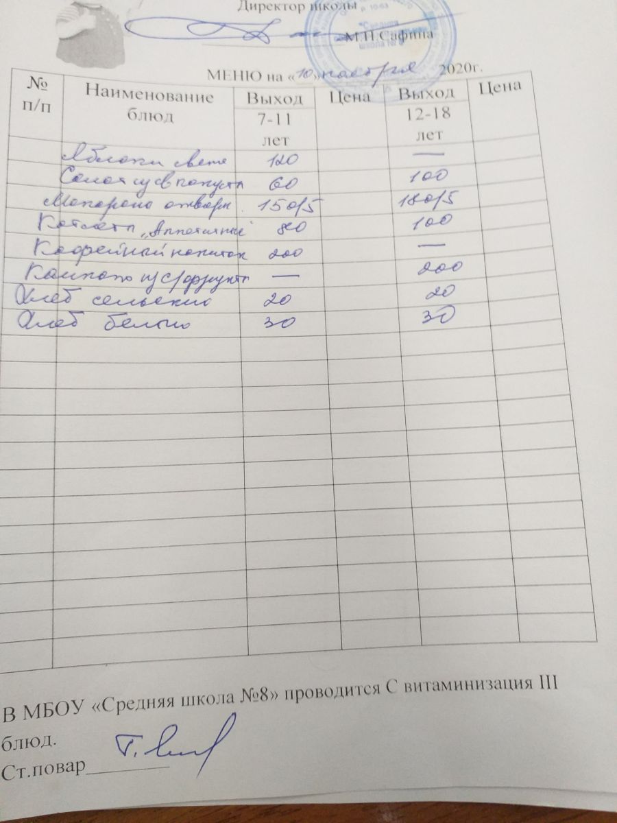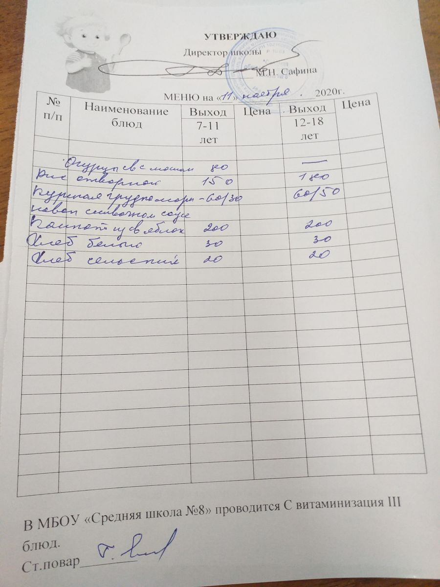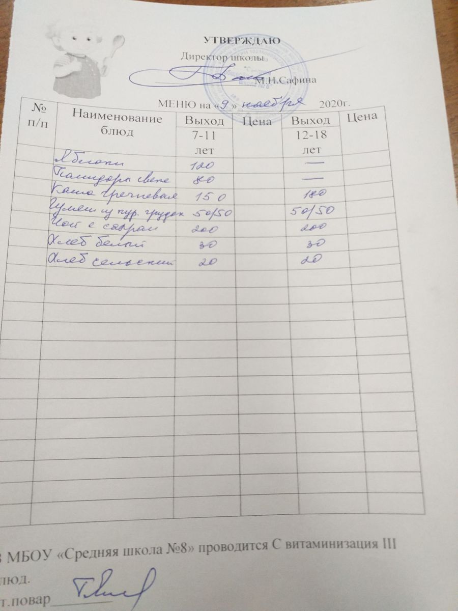 Меню на 09 ноября 2020 года. 2020 нче елның 9 нчы ноябренә меню 09.11.2020
