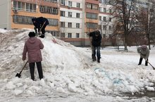Коллектив школы раскидывали снег на прилегающей территории.