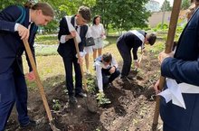 22 нче майда 9 нчы сыйныфны тәмамлаучылар, әти — әниләре ярдәме белән, роза чәчәкләрен утырту традициясен башлап җибәрделәр. -