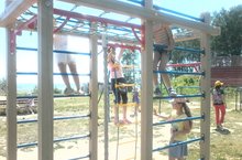 На детской площадке все так интересно,Наверное, это уже всем известно!В песочнице там я лопаткой копаю,Вожатые нас на качельках катают,И на горках целый деньВеселиться нам не лень! -