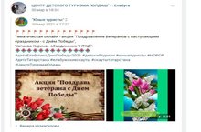Сегодня стартовала онлайн-акция "Поздравь ветерана". Педагоги уже начали выкладывать свои работы. Чапаева Карина, учащаяся объединения "НТКД", в своем видео поздравила ветеранов с наступающим Днем Победы! Педагог Исмагилова В.Н.