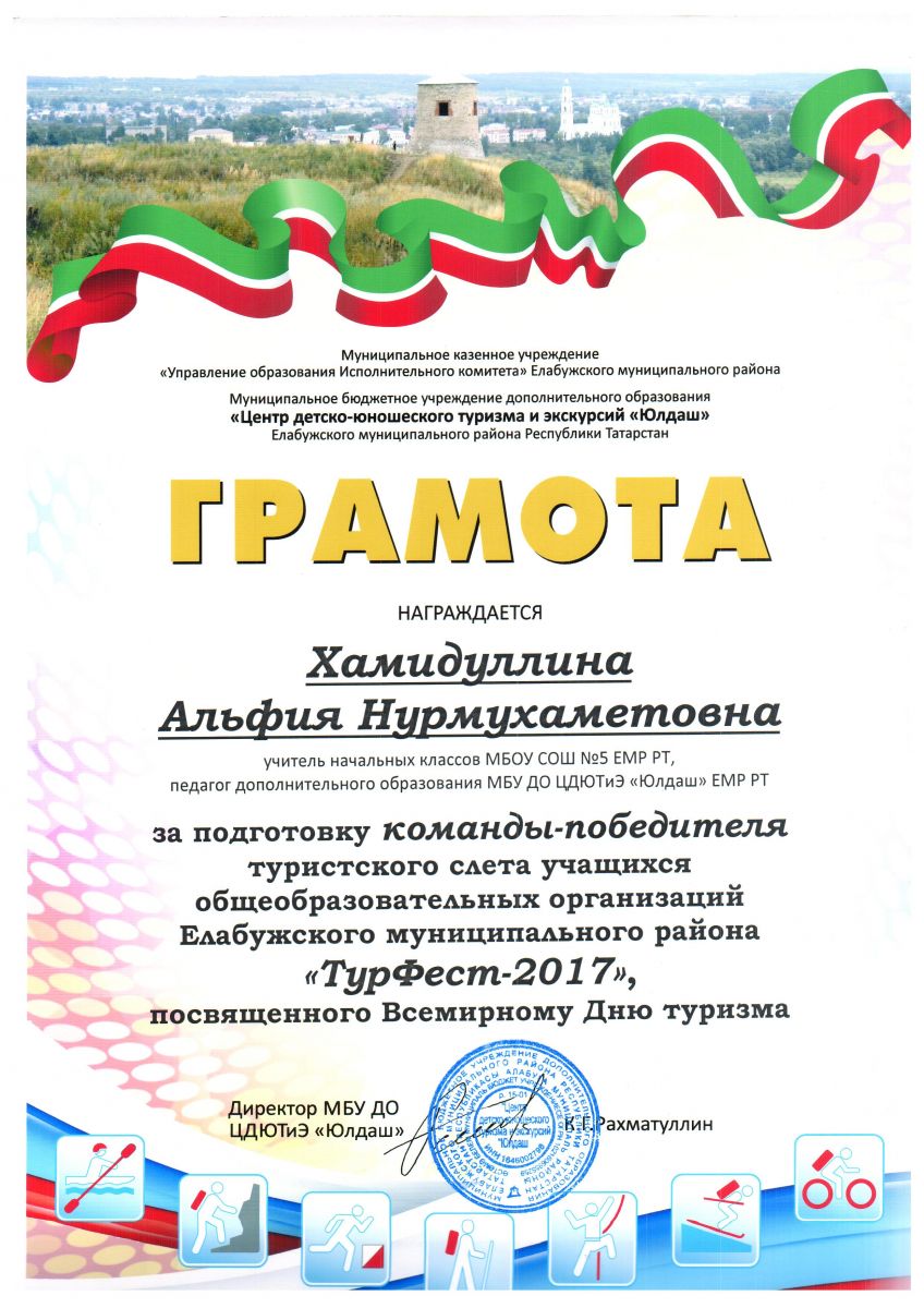 Грамота за подготовку команды-победителя "ТурФест-2017".jpg