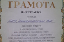 Наша команда заняла 1 место в муниципальном этапе соревнований по подвижным играм "Веселые старты" в рамках II Спартакиады среди команд общеобразовательных организаций Камско-Устьинского муниципального района. Молодцы!
