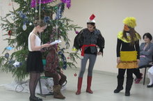 В младшем звене ведущими были семиклассники. Они приготовили свою новогоднюю программу с инсценировками сказок на новый лад. Проводились разнообразные интересные конкурсы со зрителями.