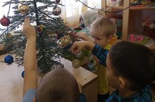 Бәйрәм чыршысын балалар үз куллары белән ясаган шарлар белән дә бизәделәр.Дети украшали елку шариками, которые сделали сами.