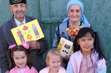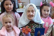 Бәйрәм көне уңаеннан балалар өлкәннәрне котладылар. По случаю праздника дети поздравили пожилых.