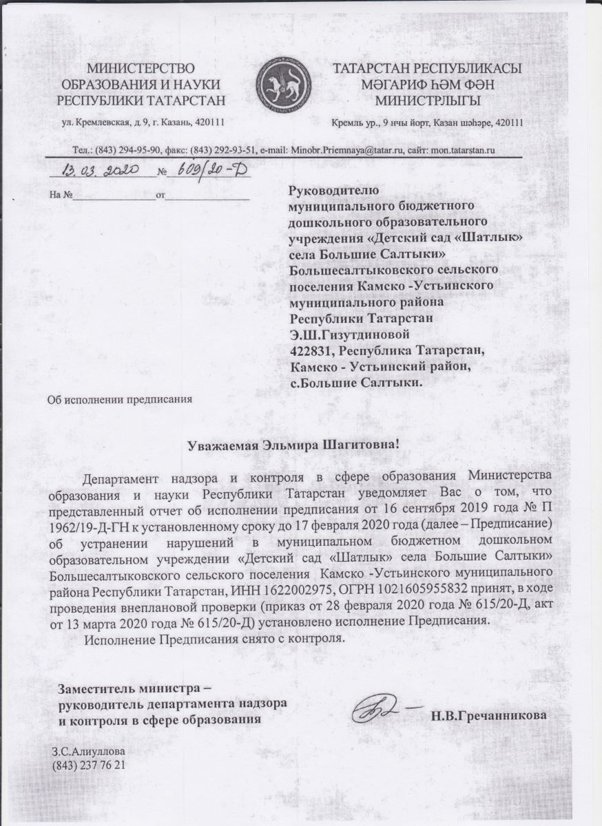 Муниципальное бюджетное дошкольное образовательное учреждение "Детский сад "Шатлык" села Большие Салтыки" Большесалтыковского сельского поселения Камско-Устьинского муниципального района Республики Татарстан/ Татарстан Республикасы Кама Тамагы муниципаль районы Олы Салтык авыл җирлеге "Олы Салтык авылының "Шатлык" балалар бакчасы" муниципаль бюджет мәктәпкәчә белем бирү учреждениесе