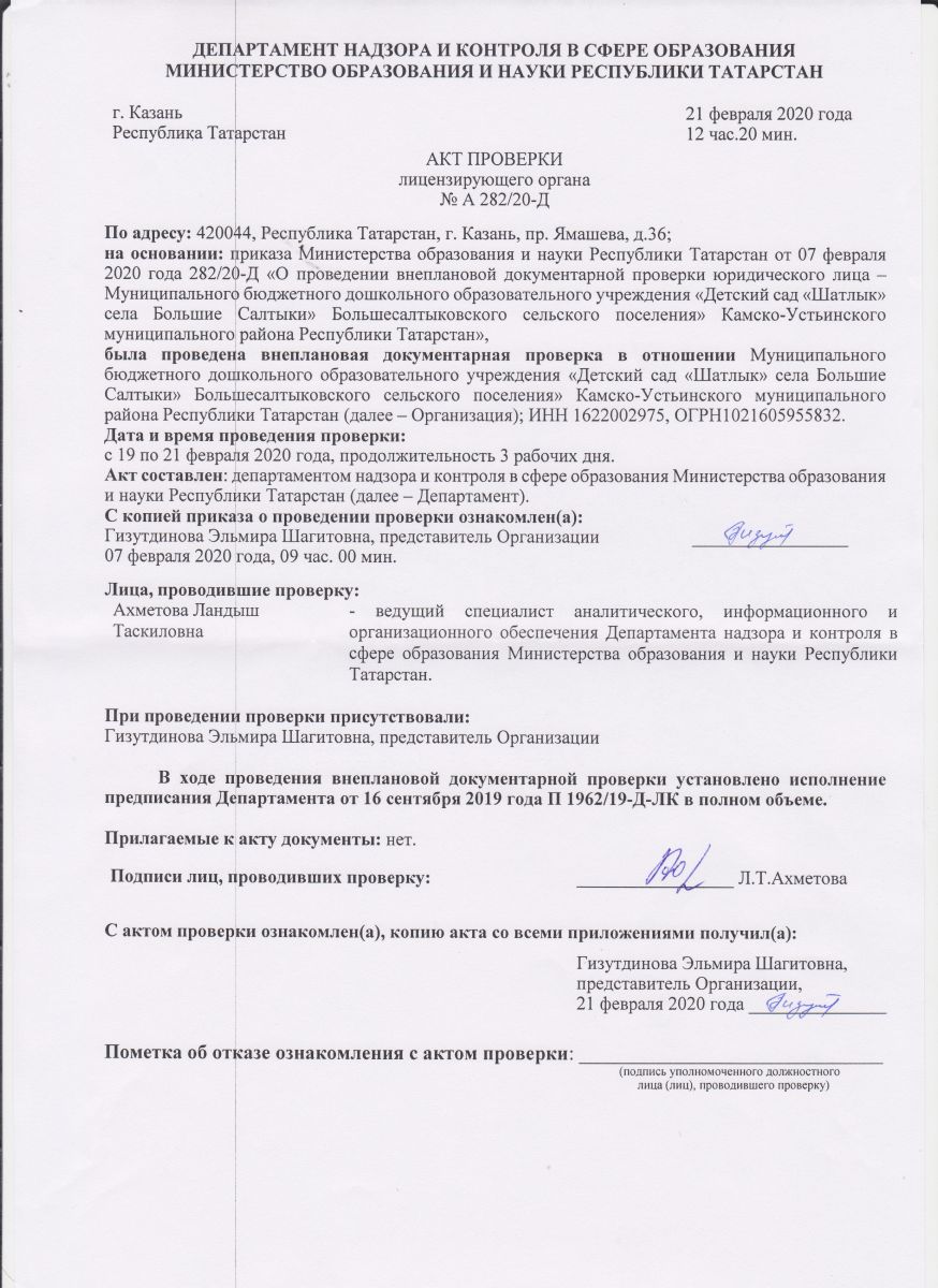 Акт проверки лицензирующего органа №А 282 /20-Д