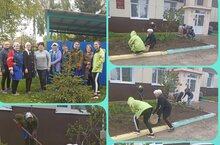 Сотрудники детского сада на субботнике по благоустройству территории. -