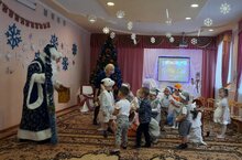 Новогодний утренник в средней Б группе. Веселые песни, танцы, жизнерадостные девчонки и мальчишки радостно встретили Деда Мороза и Снегурочку.