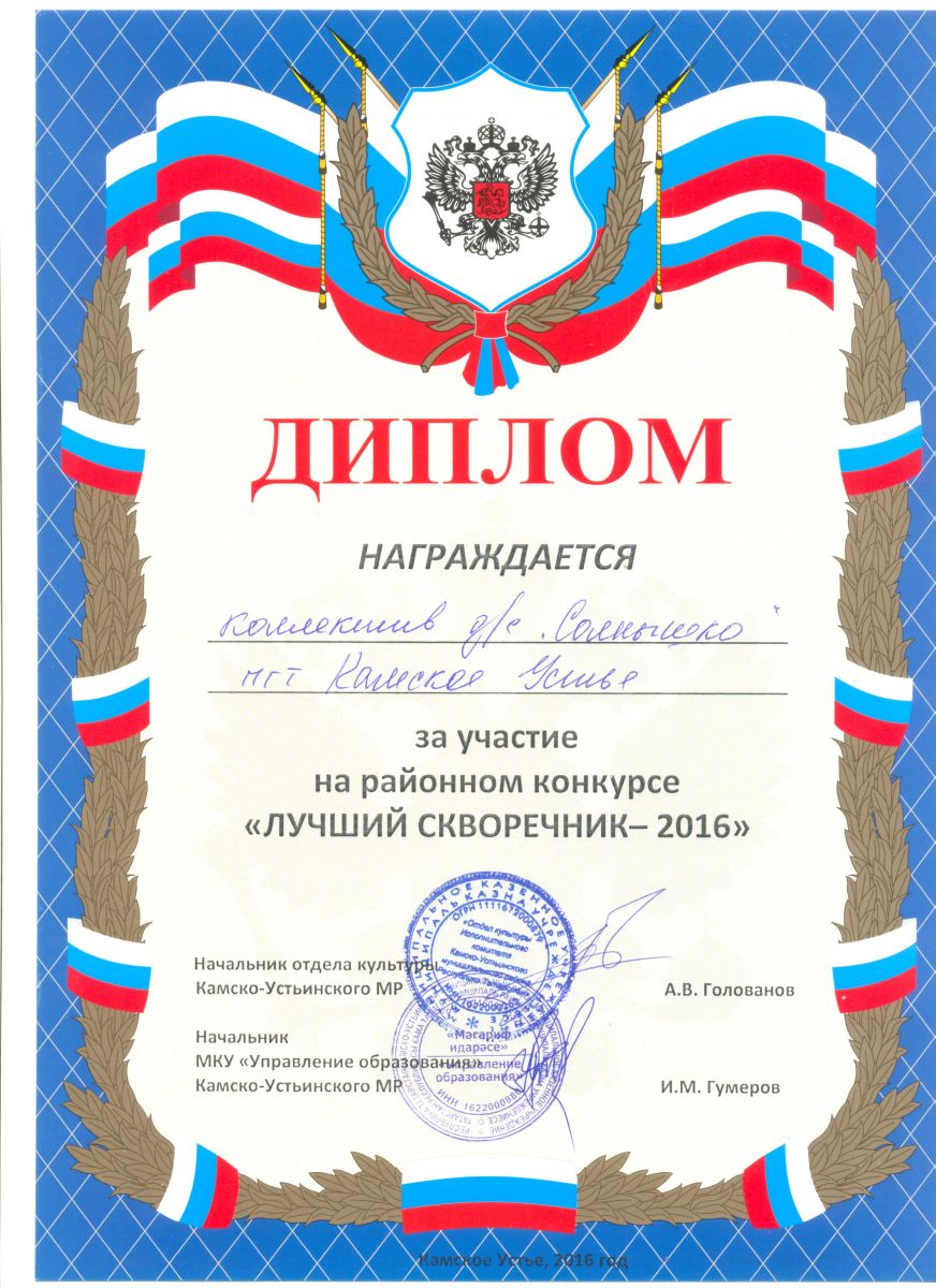 Диплом за участие на районном конкурсе "Лучший скворечник - 2016"