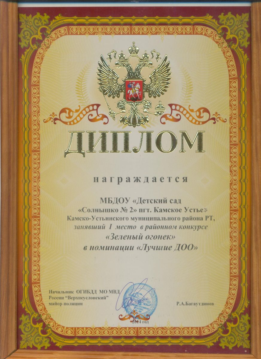 Диплом за I место в районном конкурсе "Зеленый огонек" в номинации "Лучшее ДОО" 2014 год