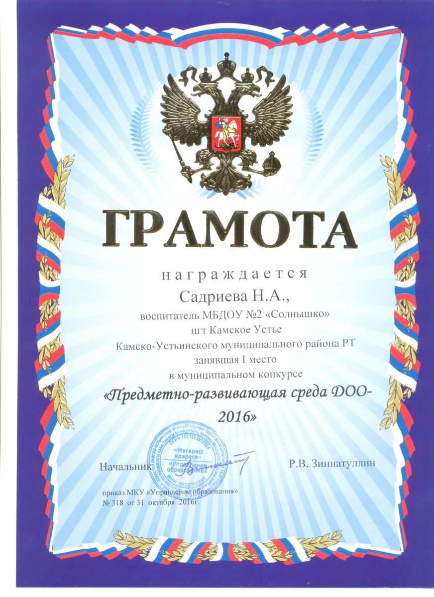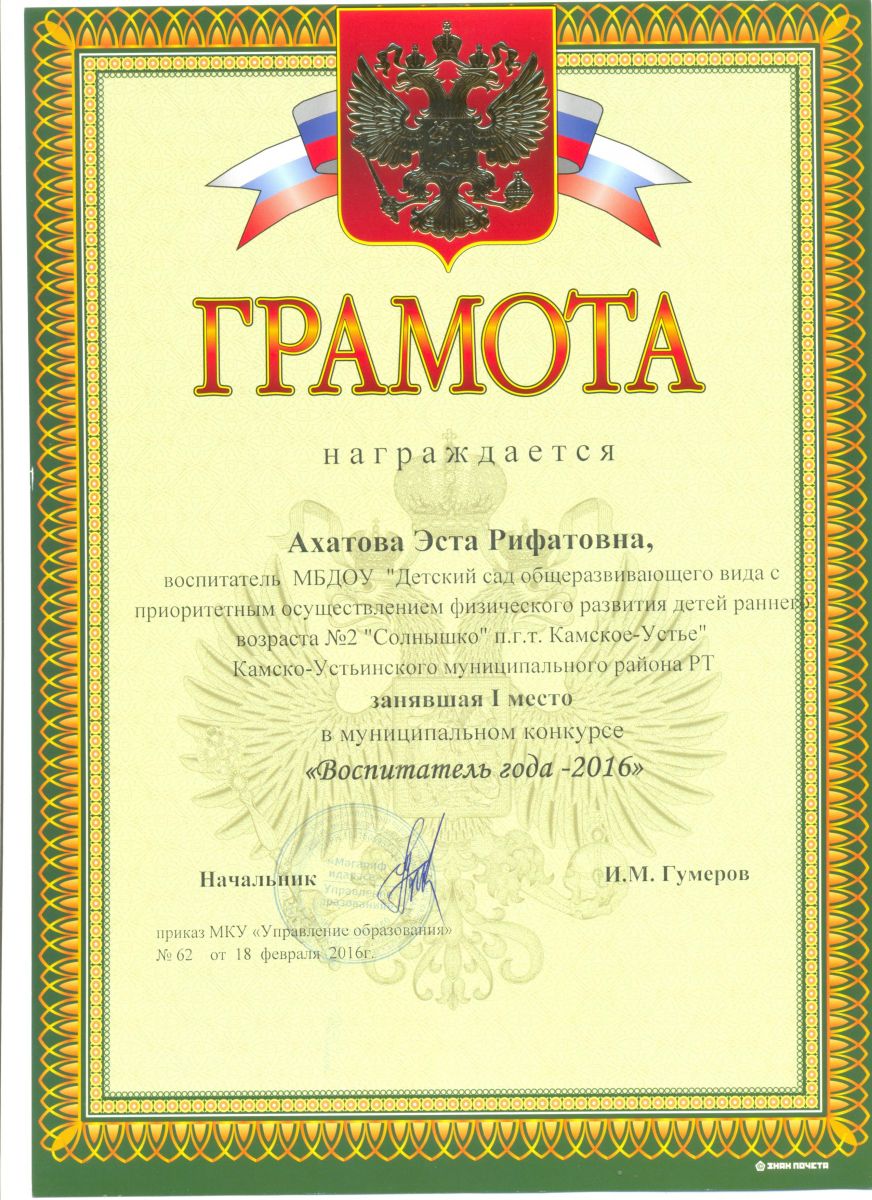 Грамота за 1 место в конкурсе "Воспитатель года - 2016"
