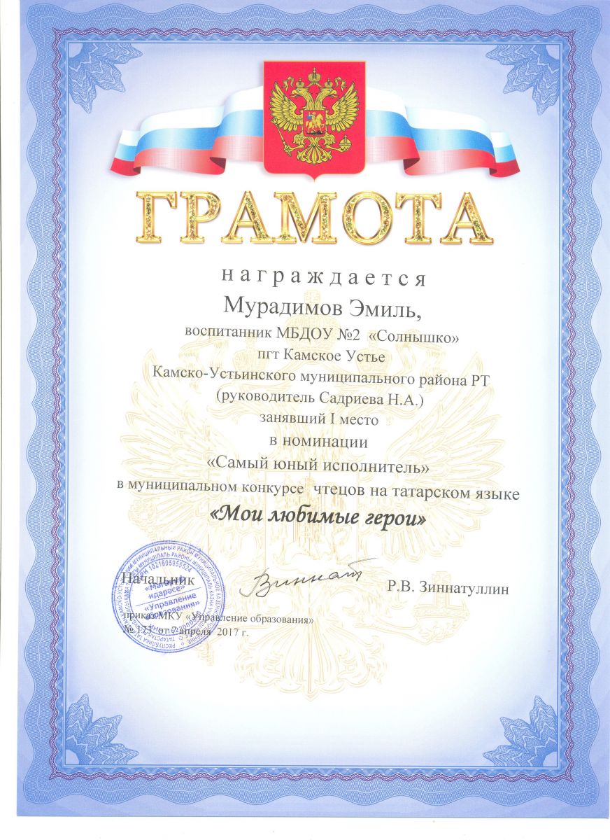 Грамота за первое место в муниципальном конкурсе чтецов на татарском языке "Мои любимые герои"