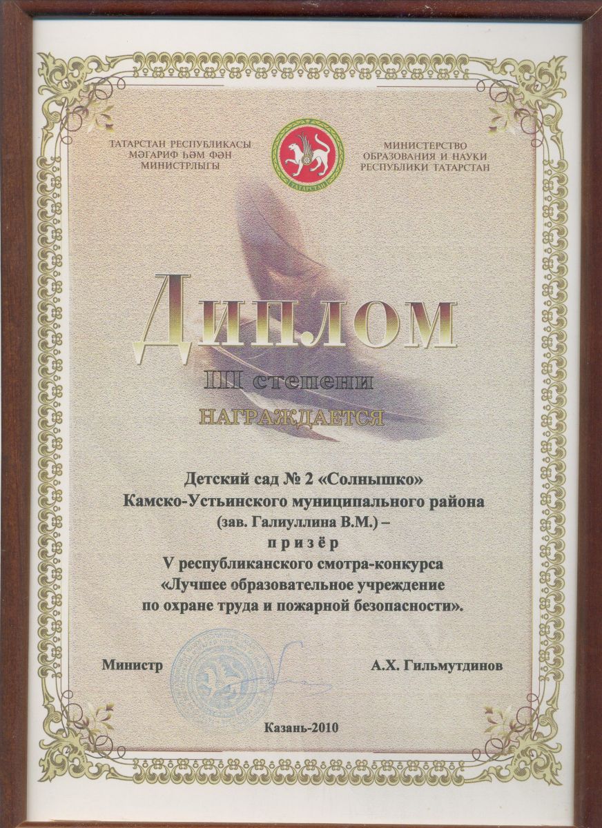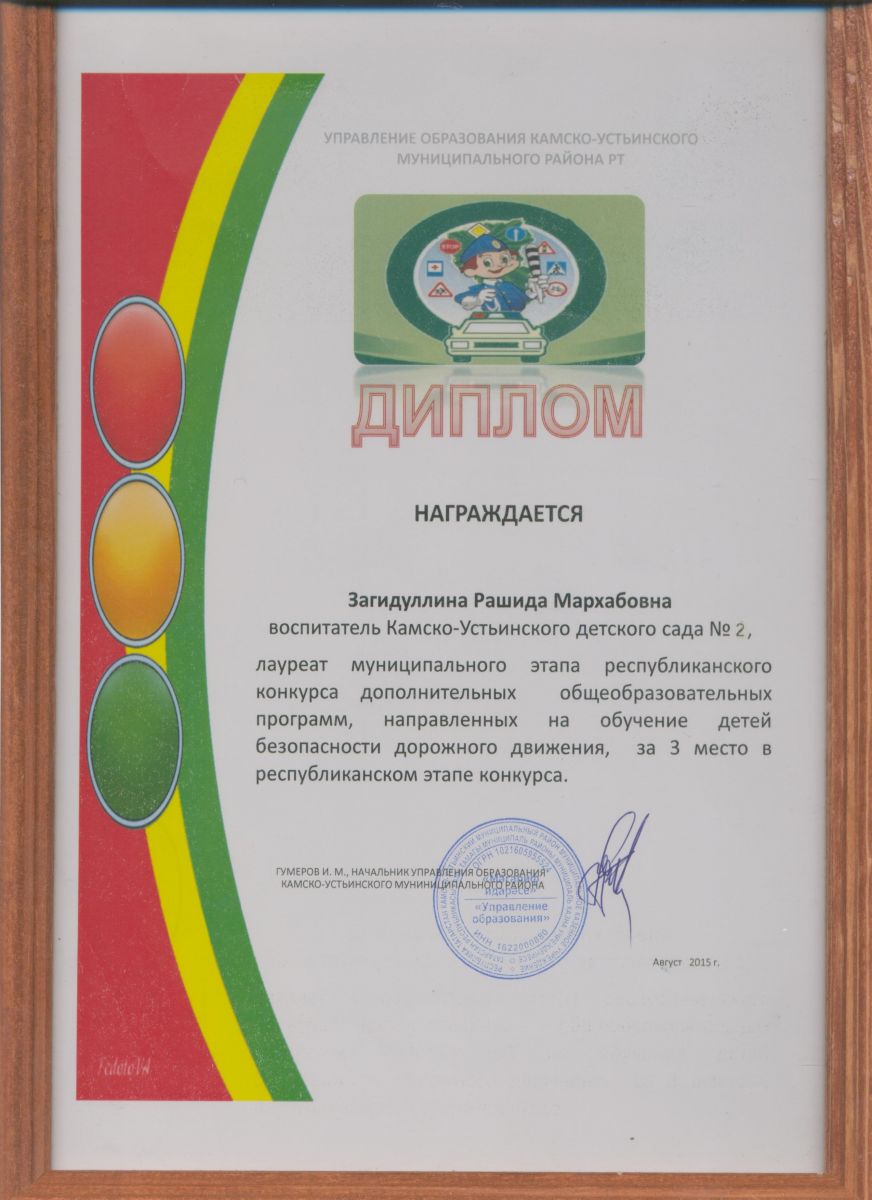 Диплом за 3 место в республиканском конкурсе ДОП по обучению правилам дорожного движения - 2015г.
