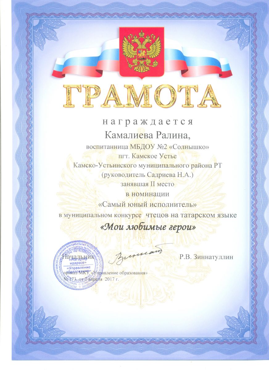 Грамота за 2 место в муниципальном конкурсе "Я говорю и работаю на татарском-2017"