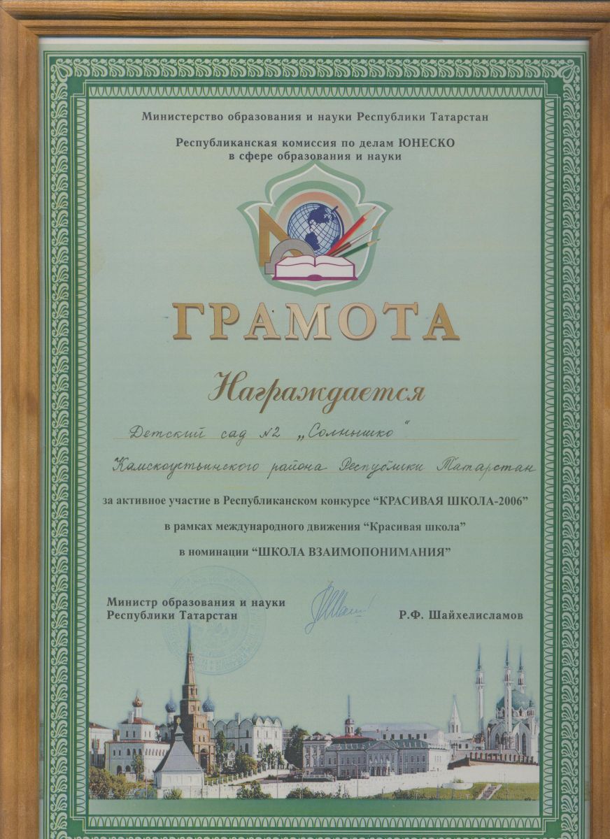Грамота за активное участие в Республиканском конкурсе "Красивая школа - 2006"