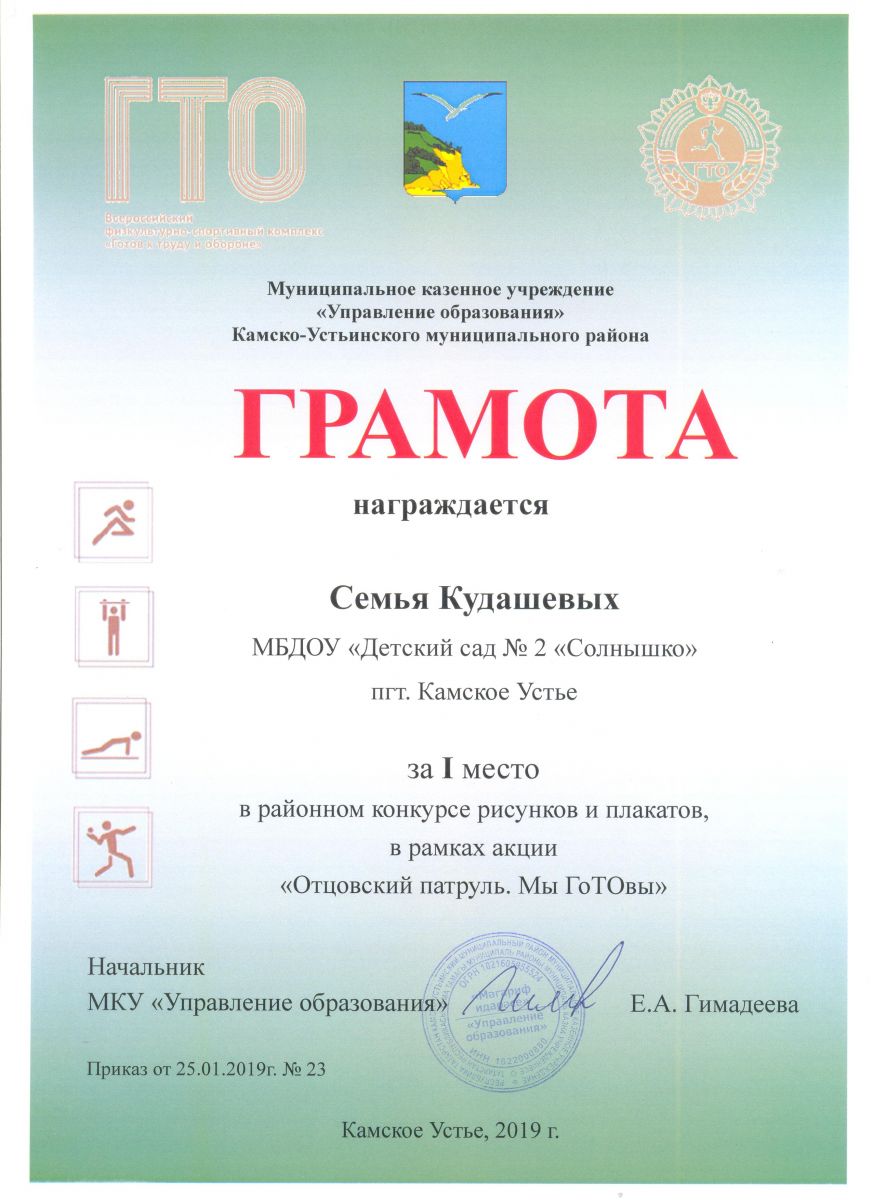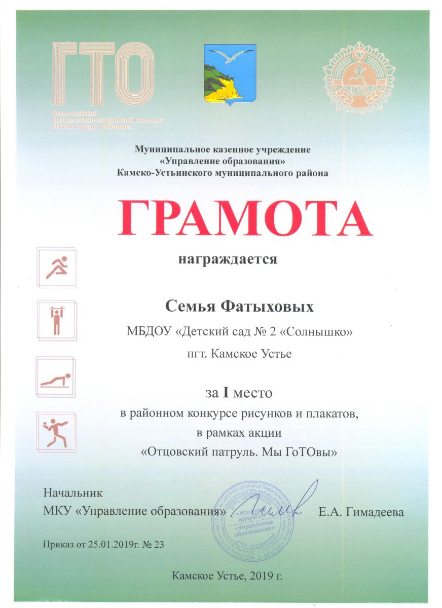 Грамота за 1 место в муниципальном конкурсе плакатов и рисунков "Отцовский патруль. Мы ГоТОвы"