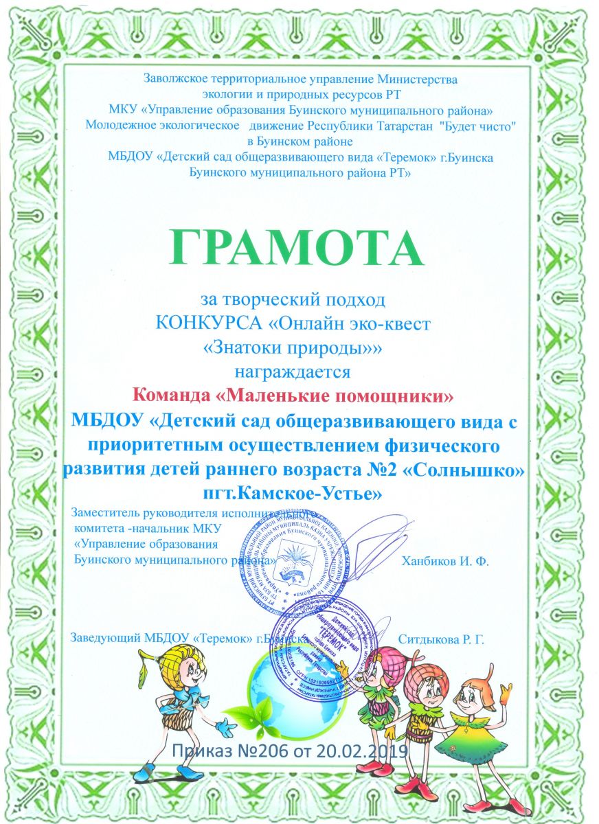 Грамота за творческий подход зонального конкурса "Онлайн эко-квест "Знатоки природы"