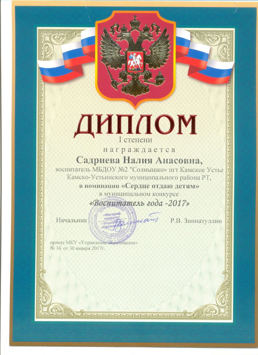 Диплом 1 степени в муниципальном конкурсе "Воспитатель года - 2017"