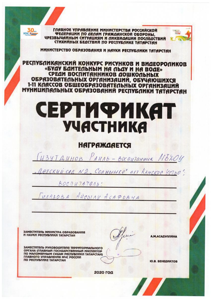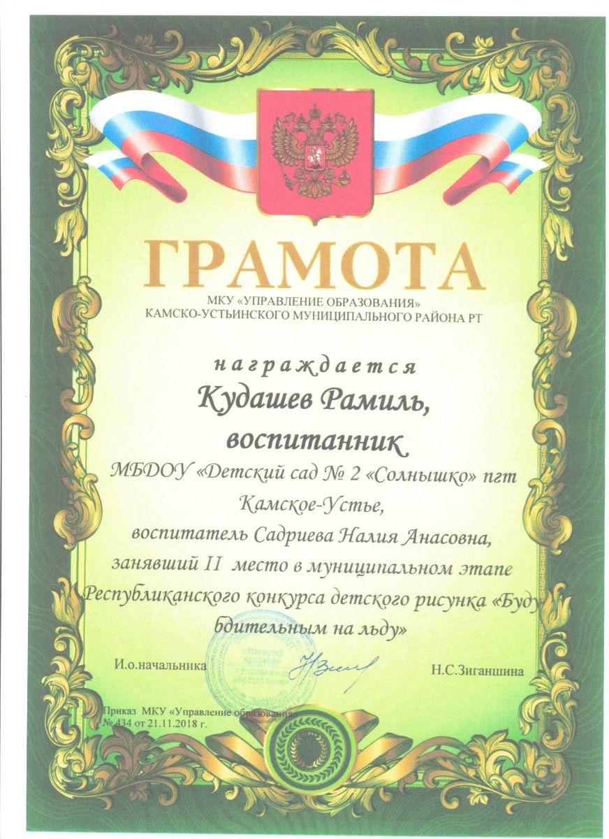 Грамота за 2 место в муниципальном конкурсе "Будь бдителен на льду"