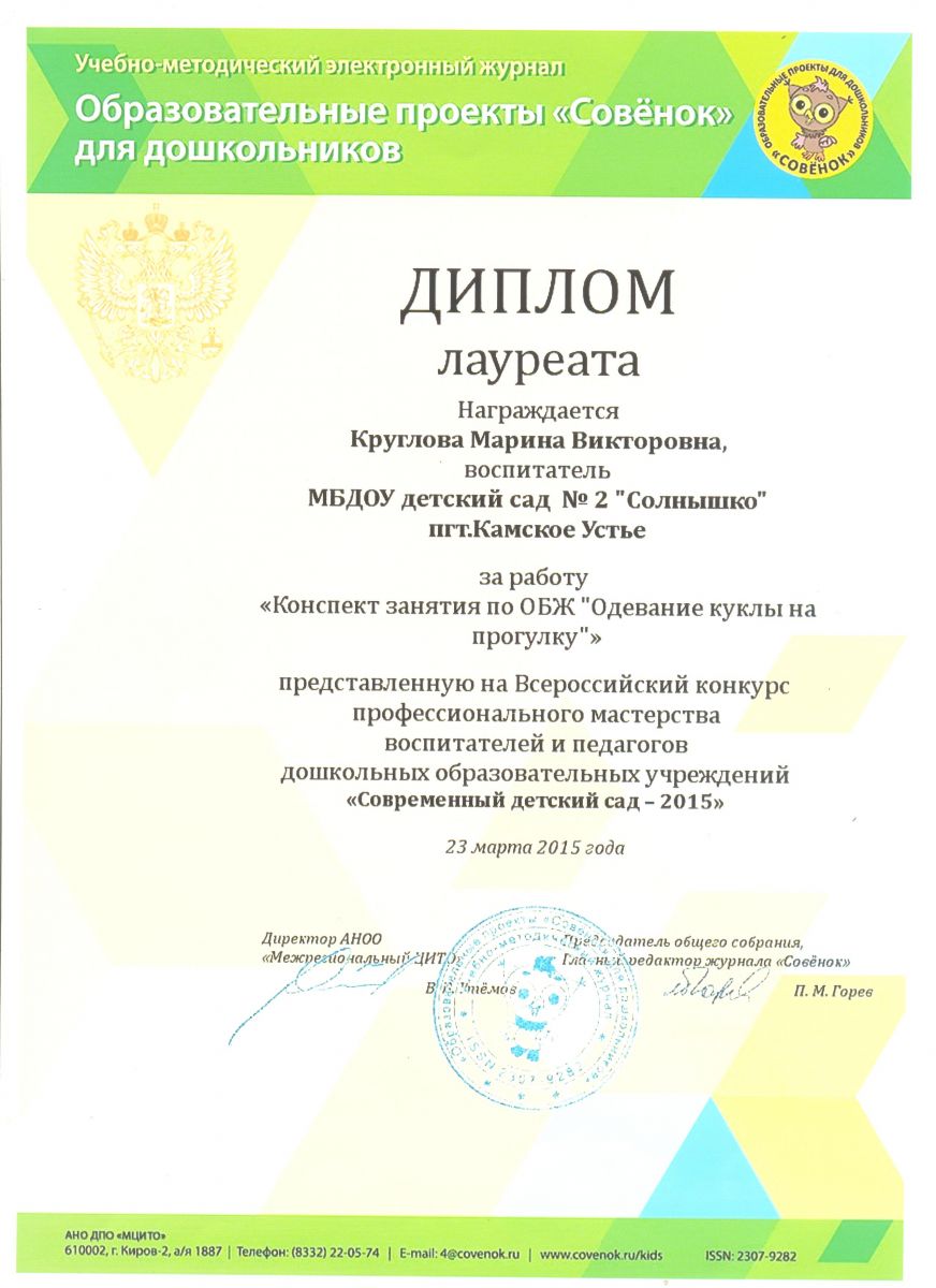Диплом лауреата Всероссийского конкурса "Современный детский сад-2015"