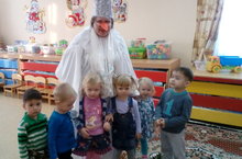 Снеговик сегодня пришел в группы раннего возраста. Воспитанники пели песни и рассказали стихи. Снеговик пригласил на праздничную елку к Деду Морозу.
