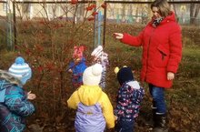 Воспитанники 2 группы раннего возраста ходили в гости к рябине. Ответили на вопросы: где листья? какое время года сейчас? какого цвета листья? и т.д.