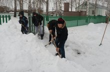 Учащиеся Кирельской школы очищают от снега памятник .