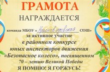Сегодня наши юные инспектора движения, учащиеся 5 класса, под руководством классного руководителя Тагирова И.Р. приняли участие в муниципальном этапе Республиканского конкурса "Безопасное колесо", посвященном 70-летию Великой Победы "Я помню! Я горжусь!"