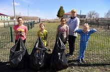 Очистка сельской спортивной площадки от мусора.