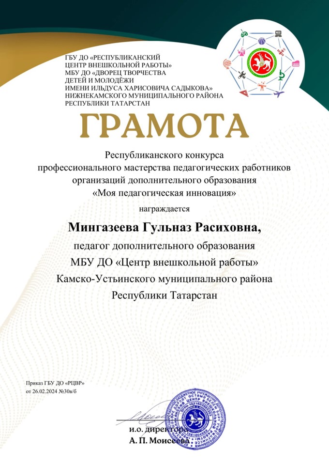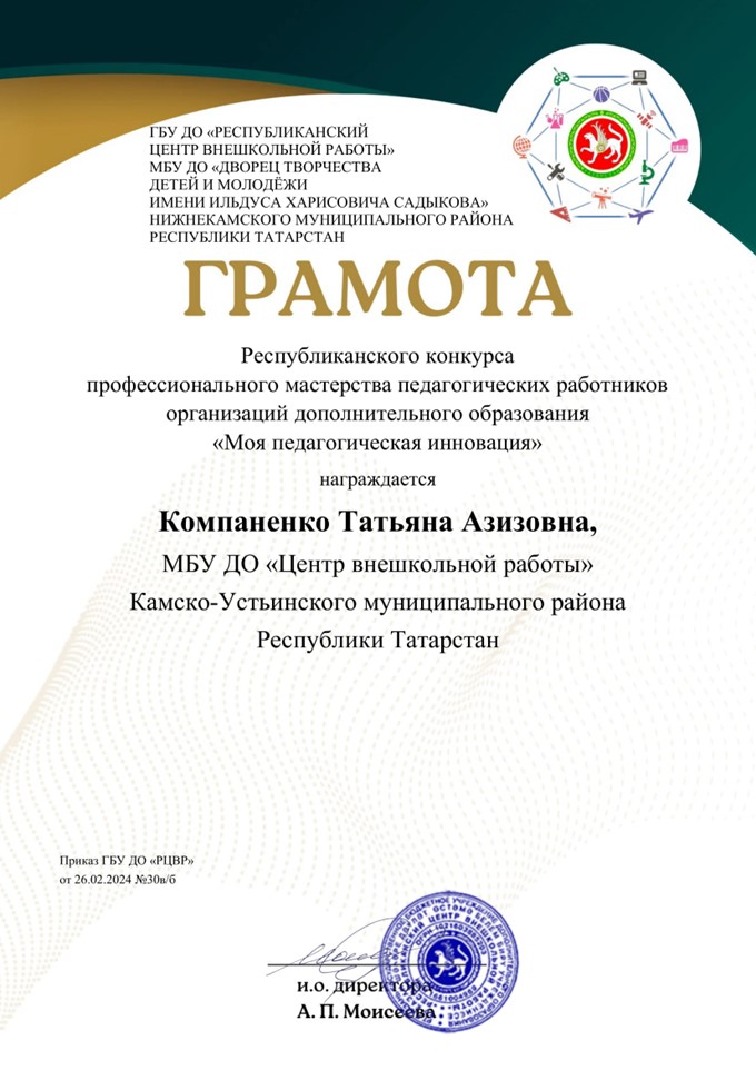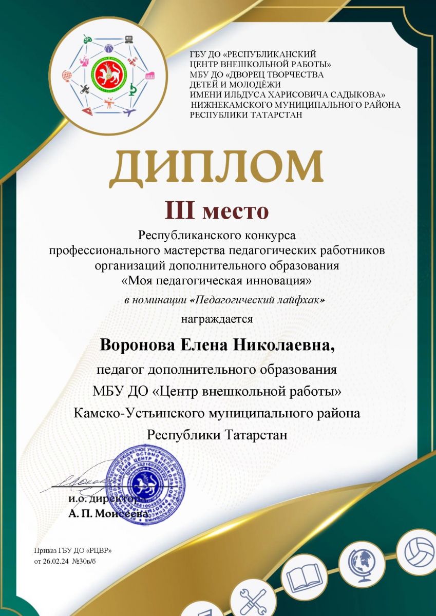 Педагог дополнительного образования МБУДО «Центр внешкольной работы» Воронова Елена Николаевна заняла 3 место в Республиканском конкурсе профессионального мастерства педагогических работников организаций дополнительного образования «Моя педагогическая инновация». Компаненко Татьяна Азизовна и Мингазеева Гульназ Расиховна награждены грамотами «За творческий подход».