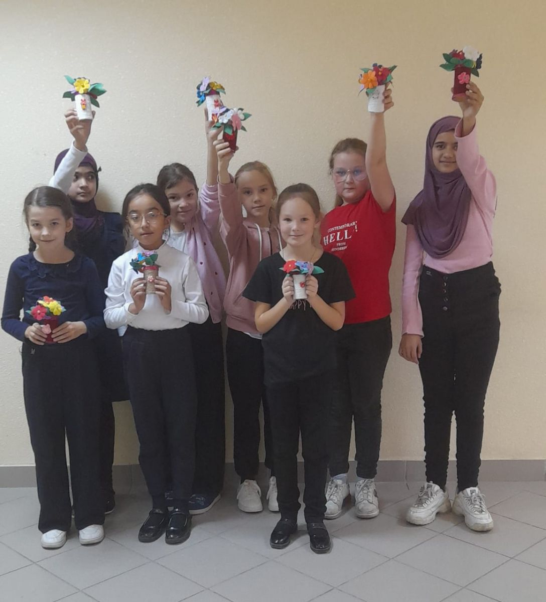 Под руководством педагога дополнительного образования Мингазеевой Г. Р. обучающиеся объединения «Изобразительное творчество» изготовили праздничный букет в технике оригами.