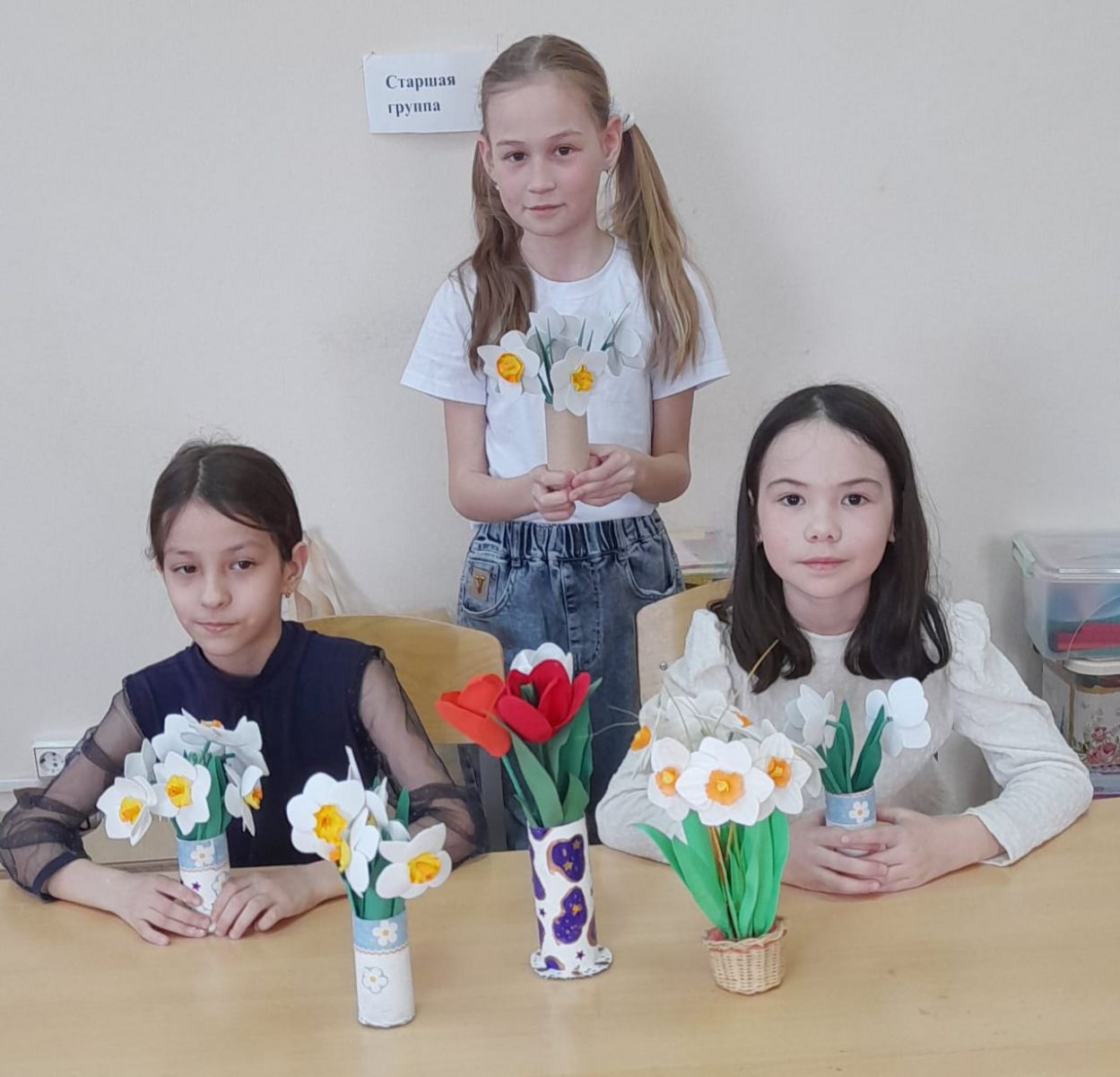 Под руководством педагога Сороковниной Г. А. обучающиеся объединения дополнительного образования «Творческая мастерская» (младшая группа) изготовили букет из искусственной флористики «Весенний первоцвет» для своих любимых мам.