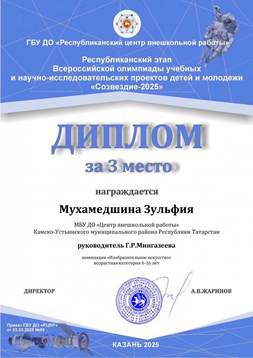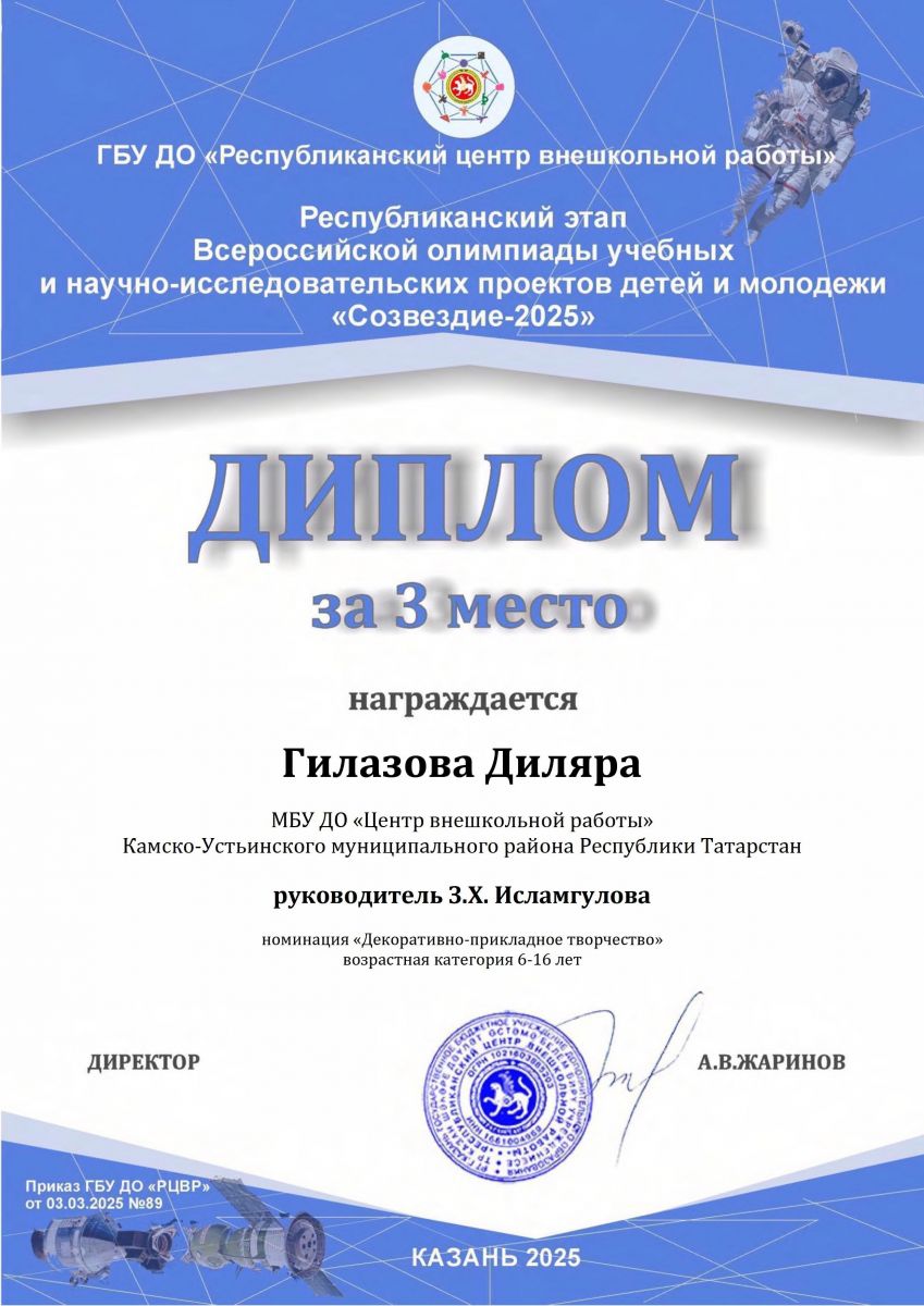 Сафарова Камиля, обучающаяся объединения дополнительного образования «Творческая мастерская» награждена дипломом 1 степени (педагог Миннуллина З.И.). Мухамедшина Зульфия из объединения «Изобразительное творчество», Гафиатуллина Самира, Гилазова Диляра, обучающиеся объединения «Арт-студия» стали дипломантами 3 степени (педагоги Мингазеева Г.Р., Исламгулова З.Х.). Каюмов Рафиль и Хайруллина Назиля награждены грамотами за творческий подход. Поздравляем победителей и участников! Желаем дальнейших творческих успехов!