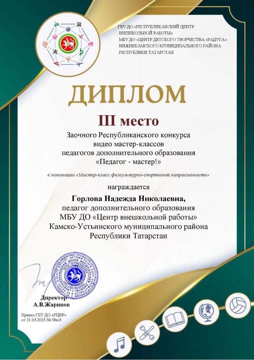 Педагог дополнительного образования Центра внешкольной работы Горлова Надежда Николаевна стала призером Республиканского конкурса видео мастер - классов «Педагог - мастер!». Поздравляем! Желаем дальнейших творческих успехов!